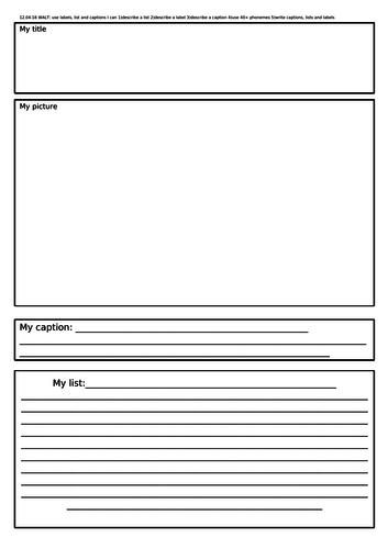 Year 1 Labels, lists and captions | Teaching Resources Year 1 Labels, lists and captions. Subject: English. Age range: 5-7. Resource type: Worksheet/Activity (no rating) 0 reviews. teachchan. 4. ... Share through facebook; Share through pinterest; File previews. docx, 426.92 KB docx, 21.71 KB docx, 80.54 KB docx, 256.1 KB. Here are some resources to support the teaching of labels, lists and ...